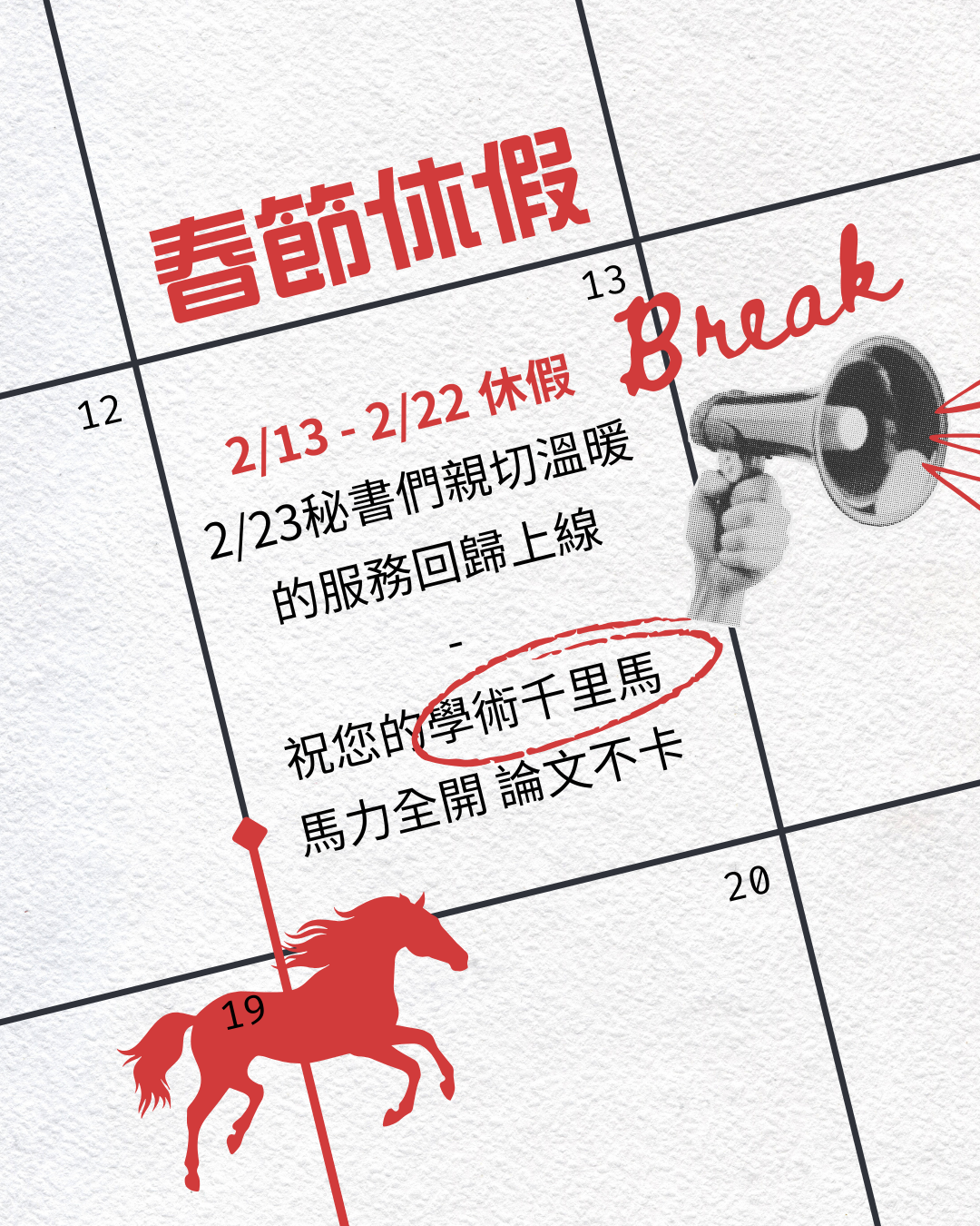 迎接新春馬年,大傳所辦公室春節休息2/13~2/22